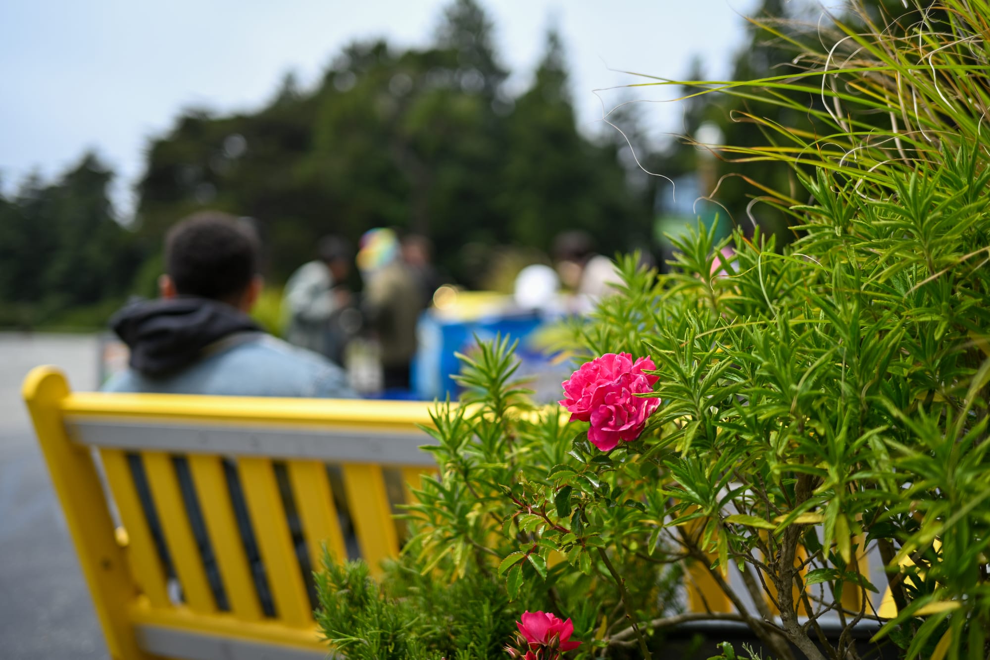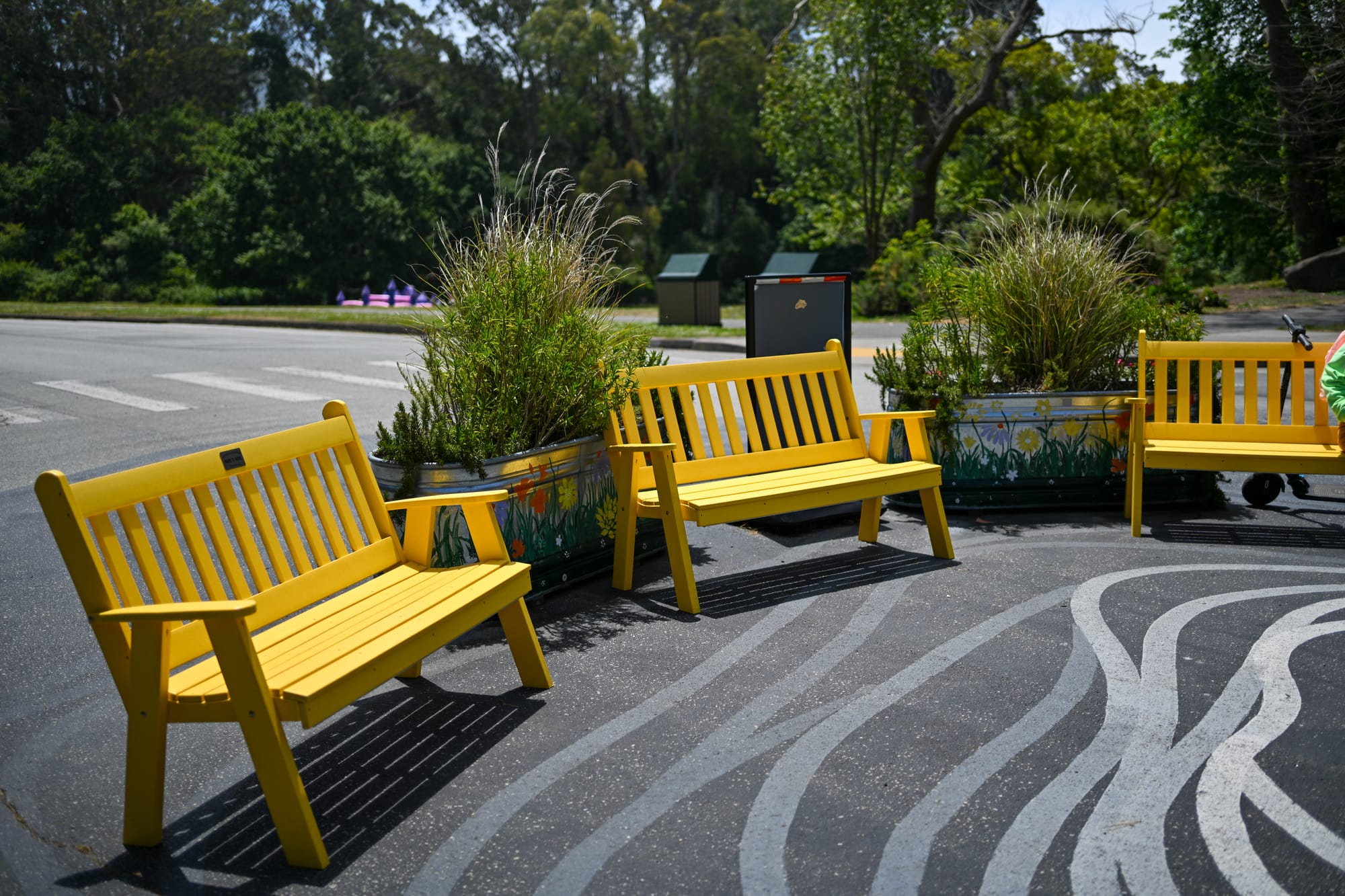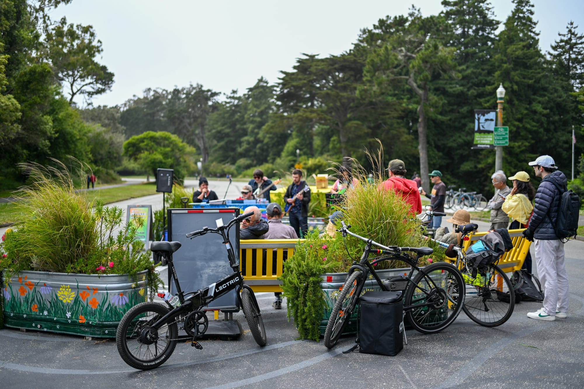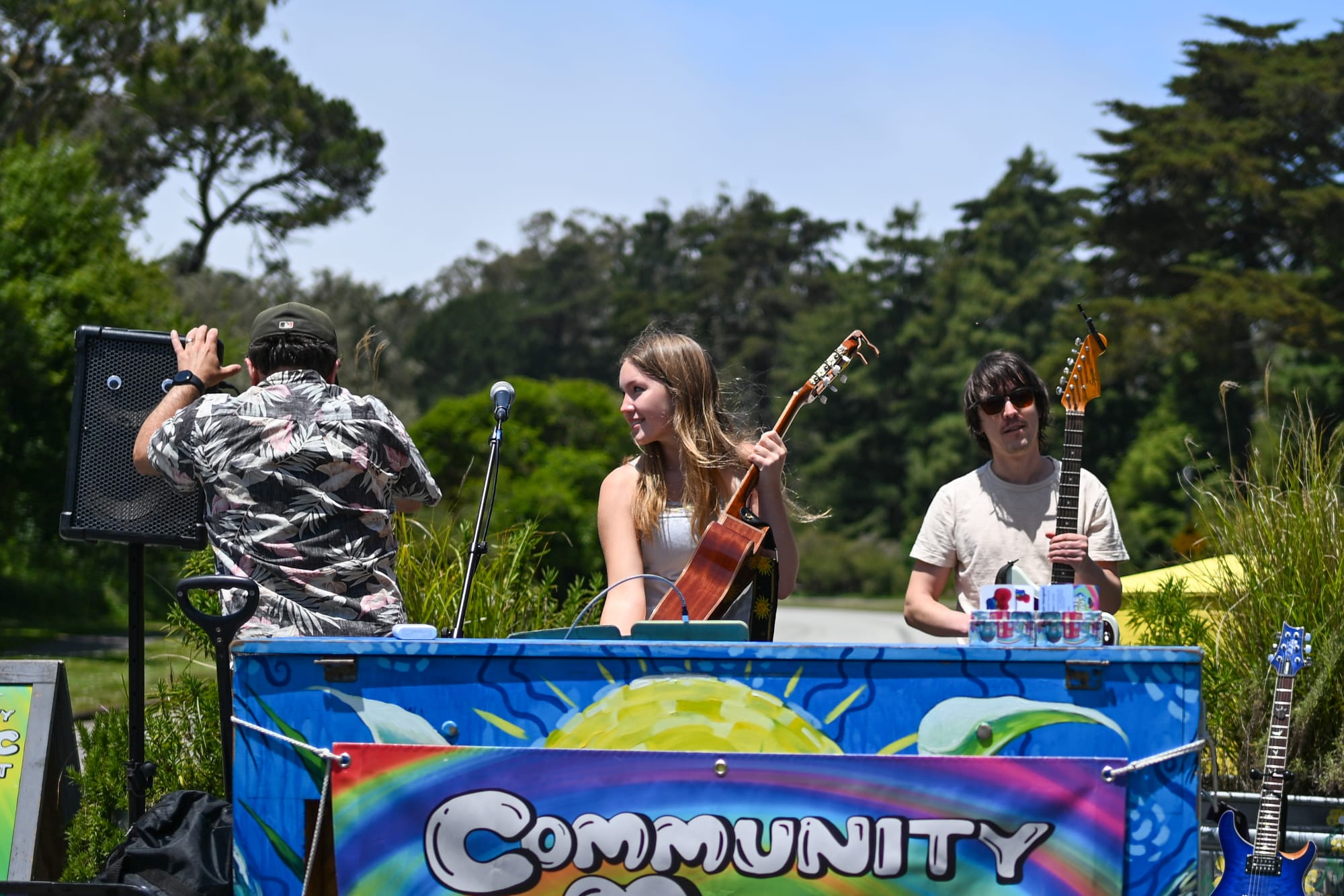 On Father's Day, I strode up to the usual Hangout spot a few minutes before the appointed noon start time. The piano was tucked away in its protective yellow box, and the surrounding benches sat empty. I spotted Dectis from afar, tugging along his cart piled high with supplies. As any seasoned San Franciscan should, he dressed in layers: a red zip-up with a Hawaiian shirt peaking through, jeans, sunglasses, and a green Giants baseball cap. Other musicians appeared with their own gear, and while they tuned their instruments, he swiftly transformed the space with equipment and signage.