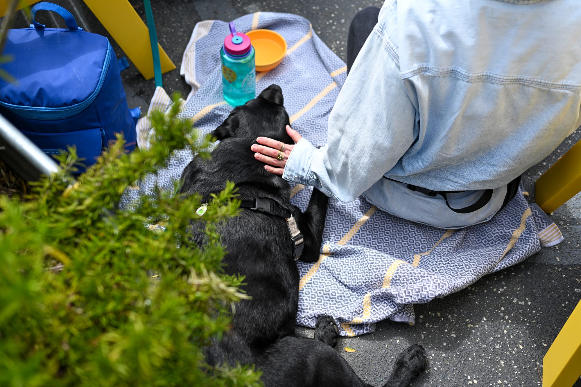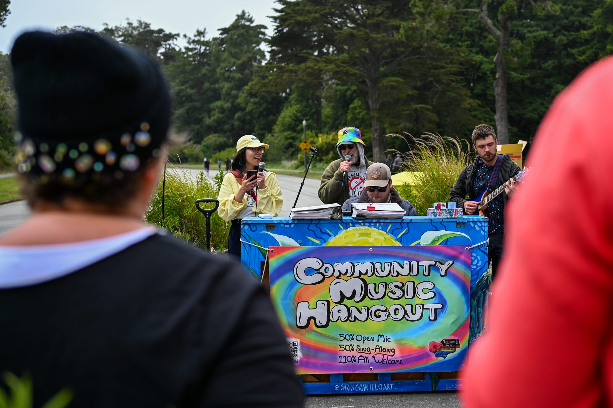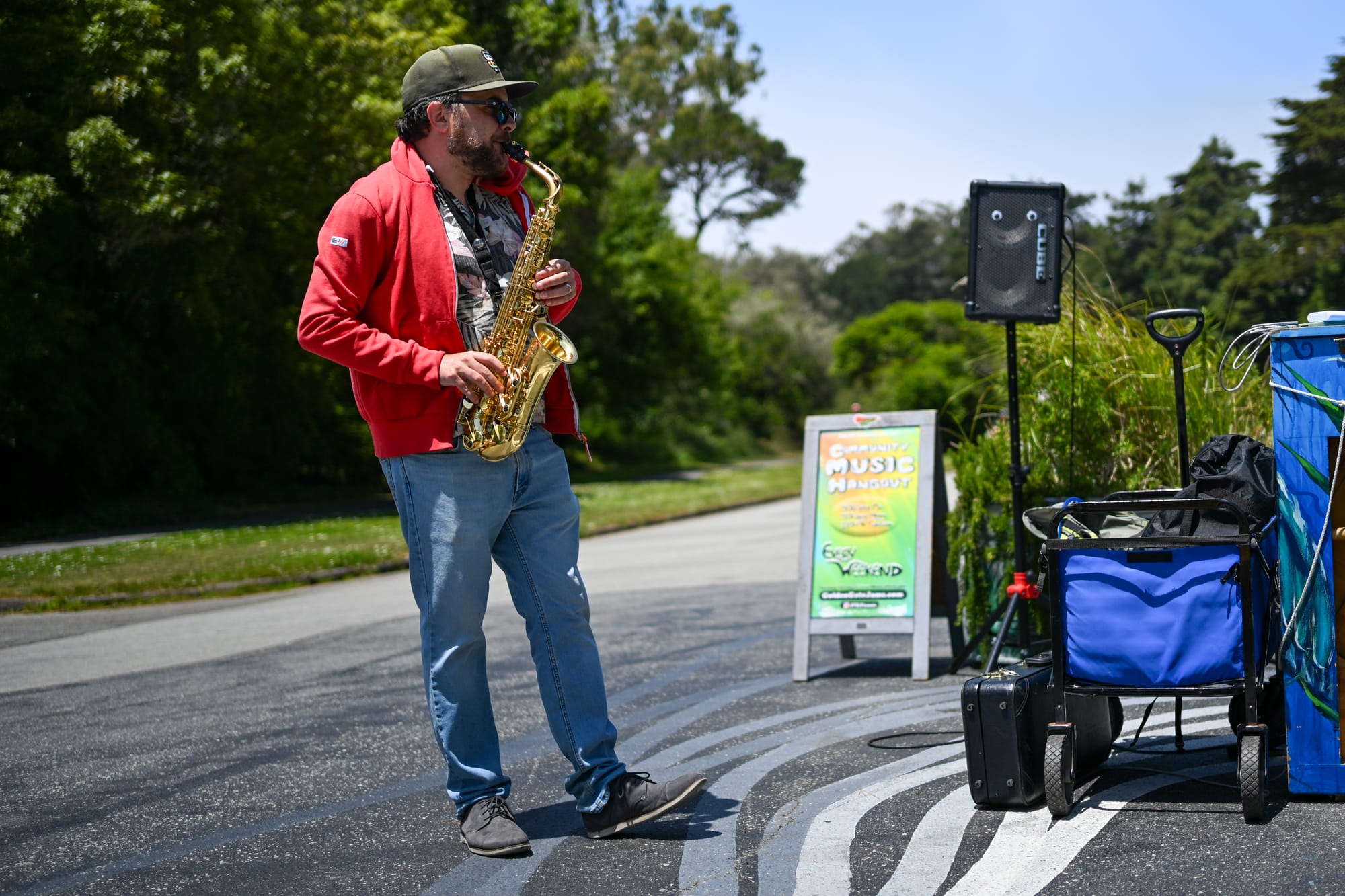 Over the past two and a half years, Dectis and a growing group of regulars have built out a full setup with battery-powered amps, speakers, mics, guitars, saxophones, and occasionally even a drum kit wheeled in on a skateboard. Both an A-frame sign and a large-format vinyl poster spell out the event in groovy letters. Earlier this spring, they hosted their 100th Hangout with upwards of 40 performers and Dectis' parents in attendance from out of town.