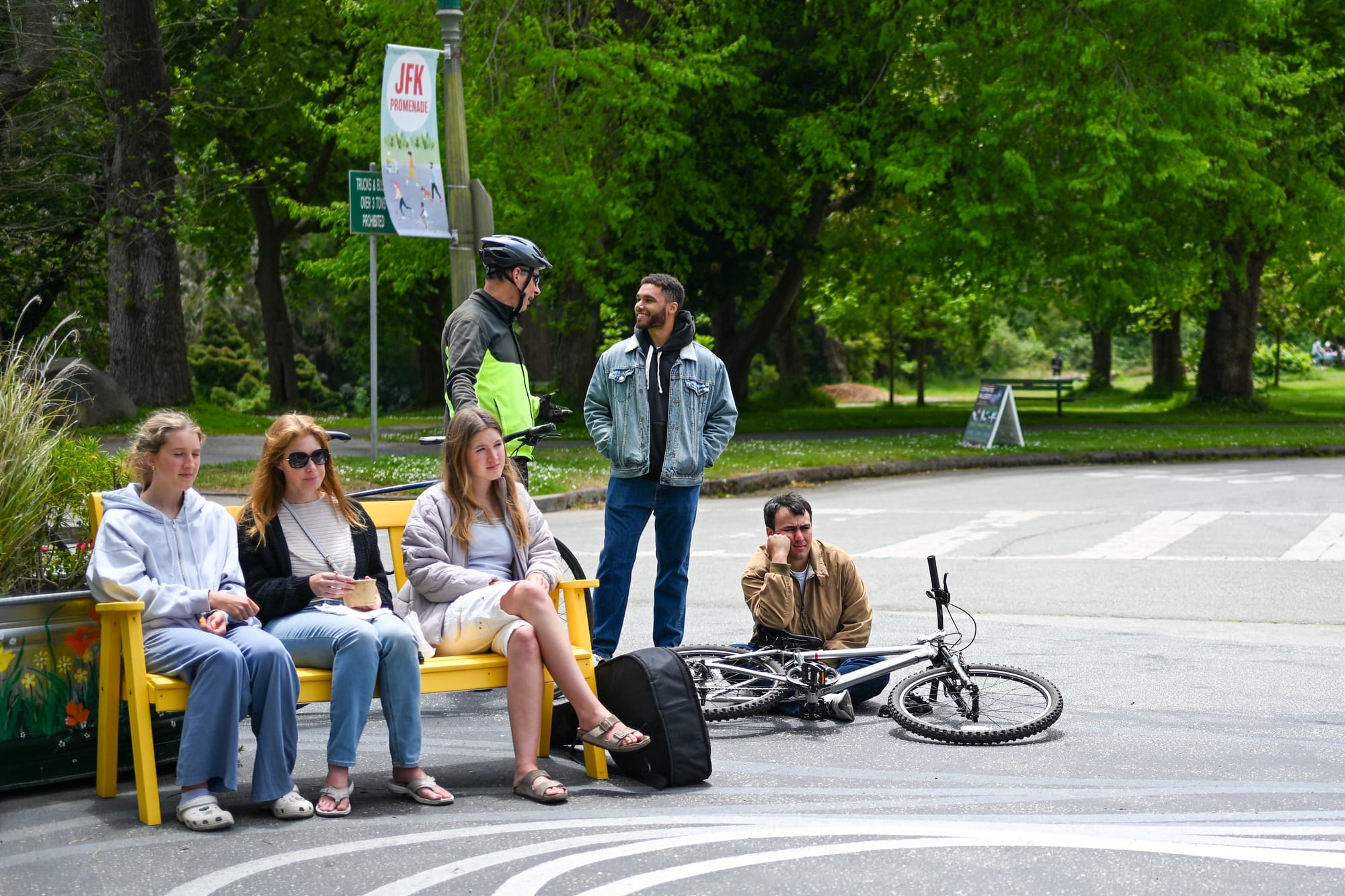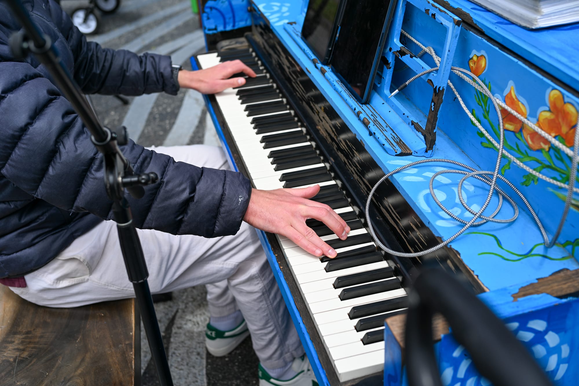 A tie-dyed sign draped across the front of the piano defines the Community Music Hangout as "50% open mic, 50% sing-along, 110% all welcome." Dan Dectis, the event's founder, created these weekly Hangouts to bring strangers together through music. In the middle of the park's car-free street, he encourages people to perform whatever song they desire, offering an alternative to our culture’s growing fear of vulnerability or appearing “cringe”.